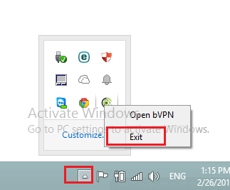Go to task bar click “Show hidden icons”, right click on b.VPN icon and click “Exit”.